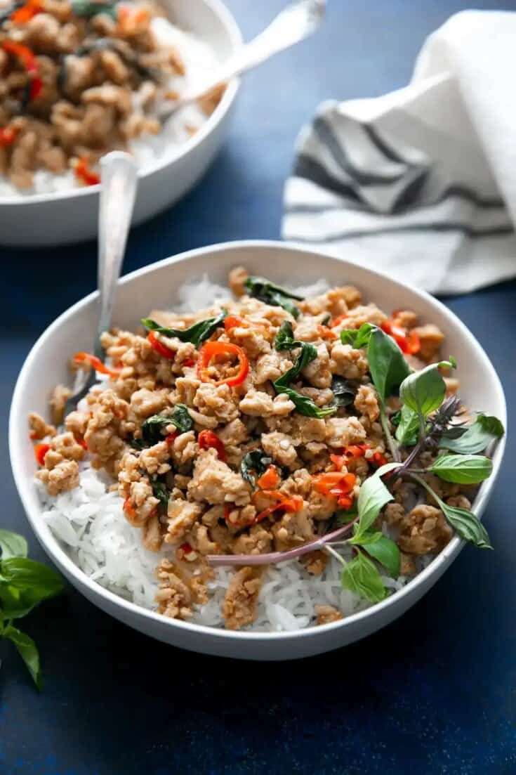 Made with delicious bits of ground chicken, shallots, and fresh basil stir-fried in a light and flavorful sauce filled with lots of heat and just the right amount of sweetness, this Thai Basil Chicken Recipe is the perfect ground chicken recipe. Serve with cauliflower rice to keep it low in carbs and keto-friendly.