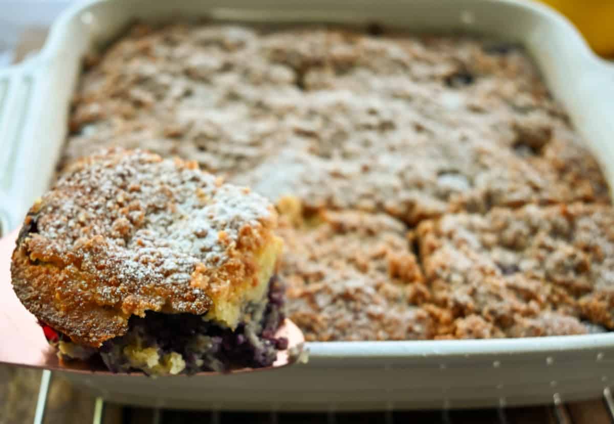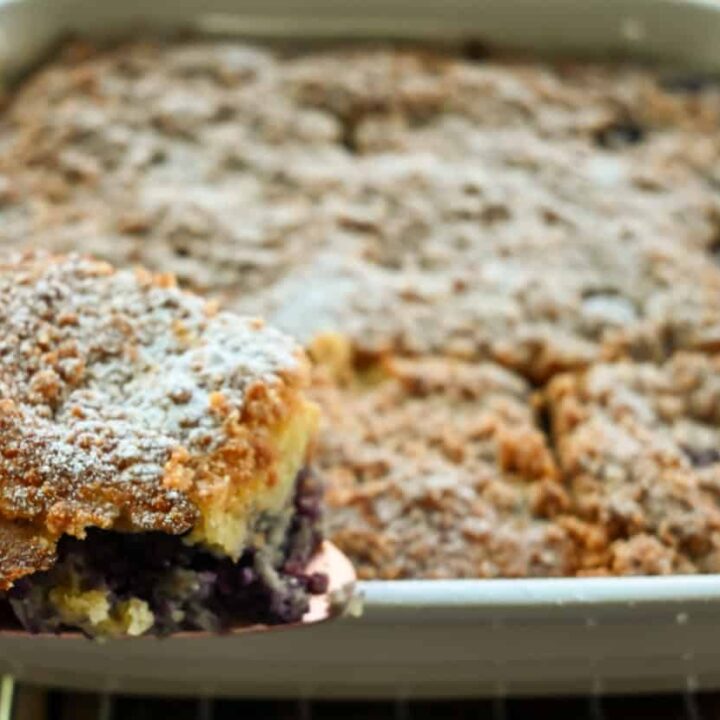 This keto blackberry coffee cake is a tender, moist low-carb cake featuring fresh blackberries and topped with a rich, buttery streusel.