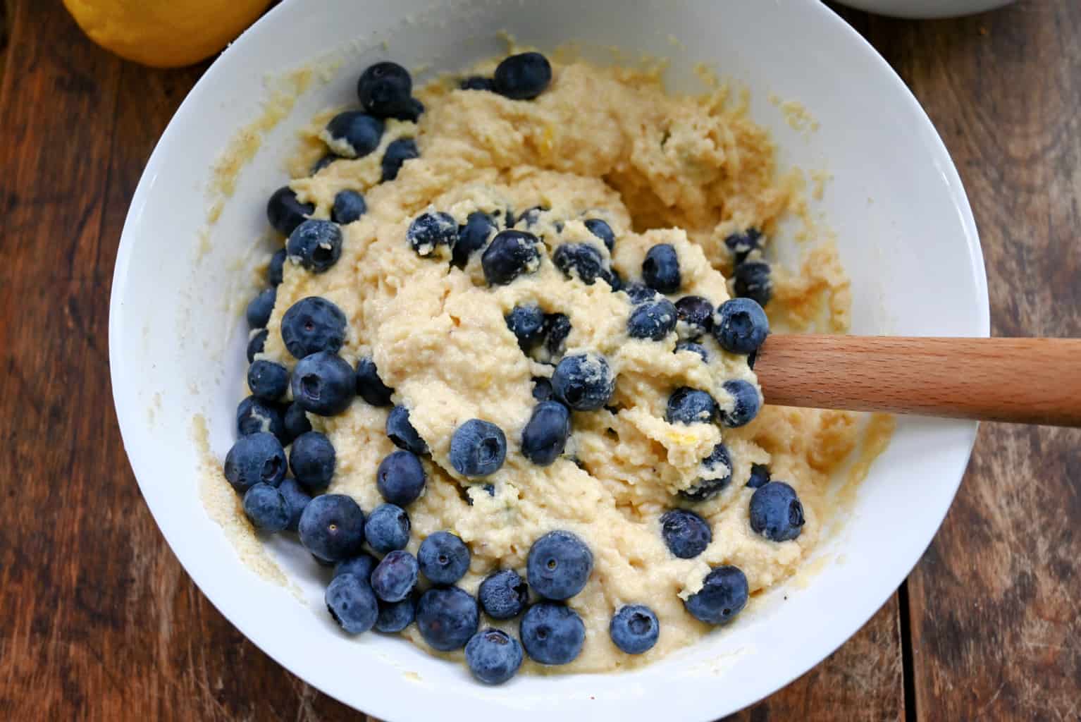 Fold the butter and sour cream mixture into the dry ingredients, then mix until well incorporated. Gently fold in the blueberries.