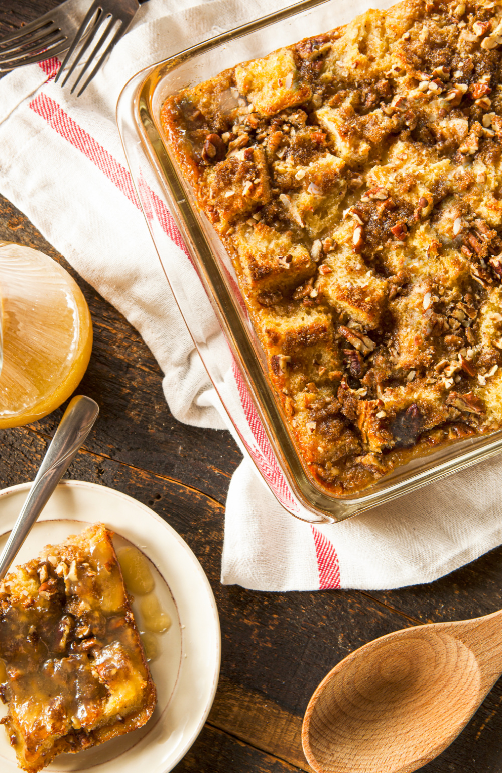 Transfer the mixture into the buttered 9 x 13-inch baking pan, pressing the bread down to ensure it is submerged in the egg mixture. If desired, sprinkle optional pecans on top of the bread pudding.
