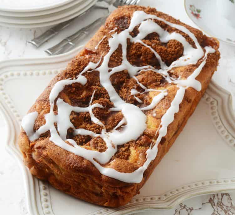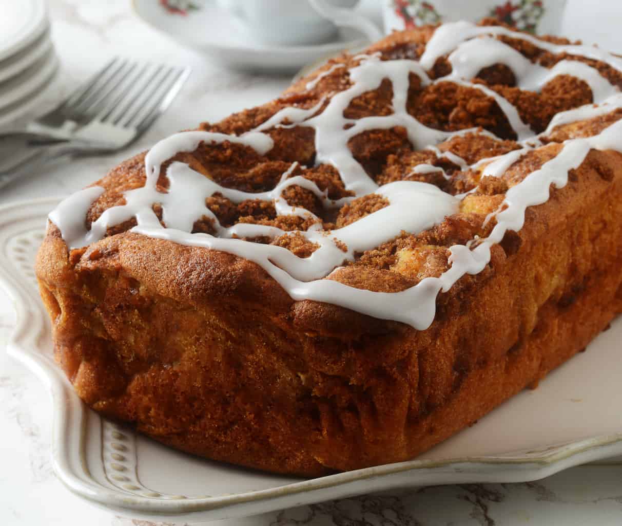 My keto cinnamon bread is quick and easy to make and features a delicious cinnamon swirl and vanilla icing drizzle.