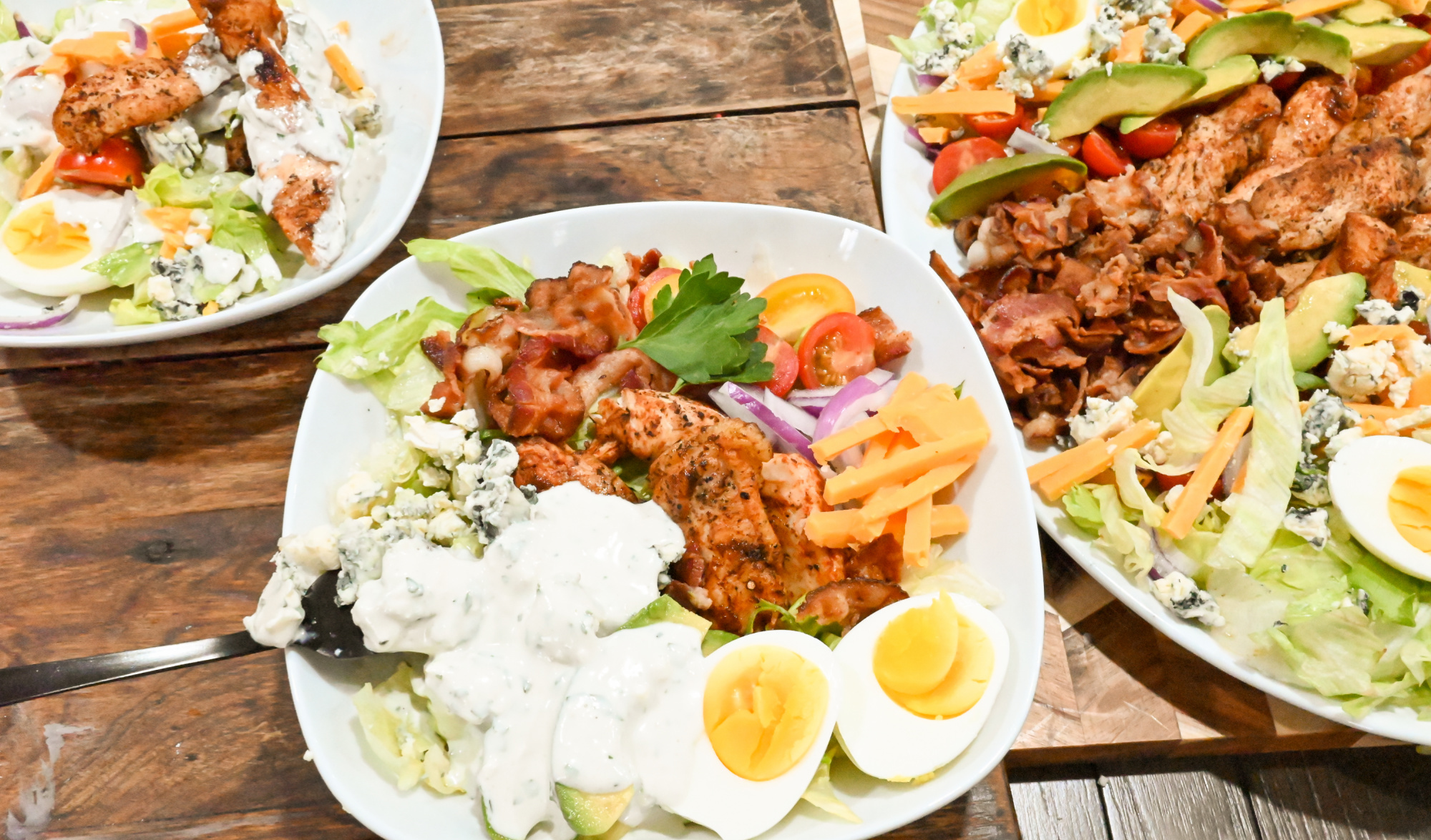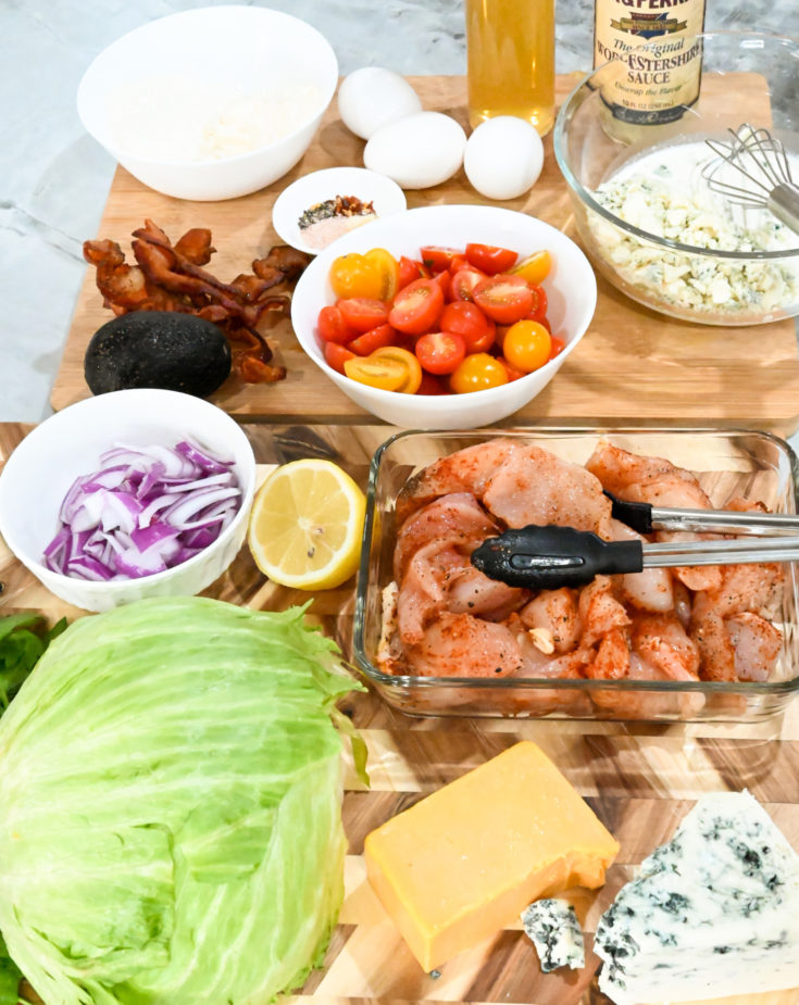 Made with sliced chicken, chopped lettuce, tomatoes, crispy bacon, hard-boiled eggs, avocado, and blue cheese crumbles.