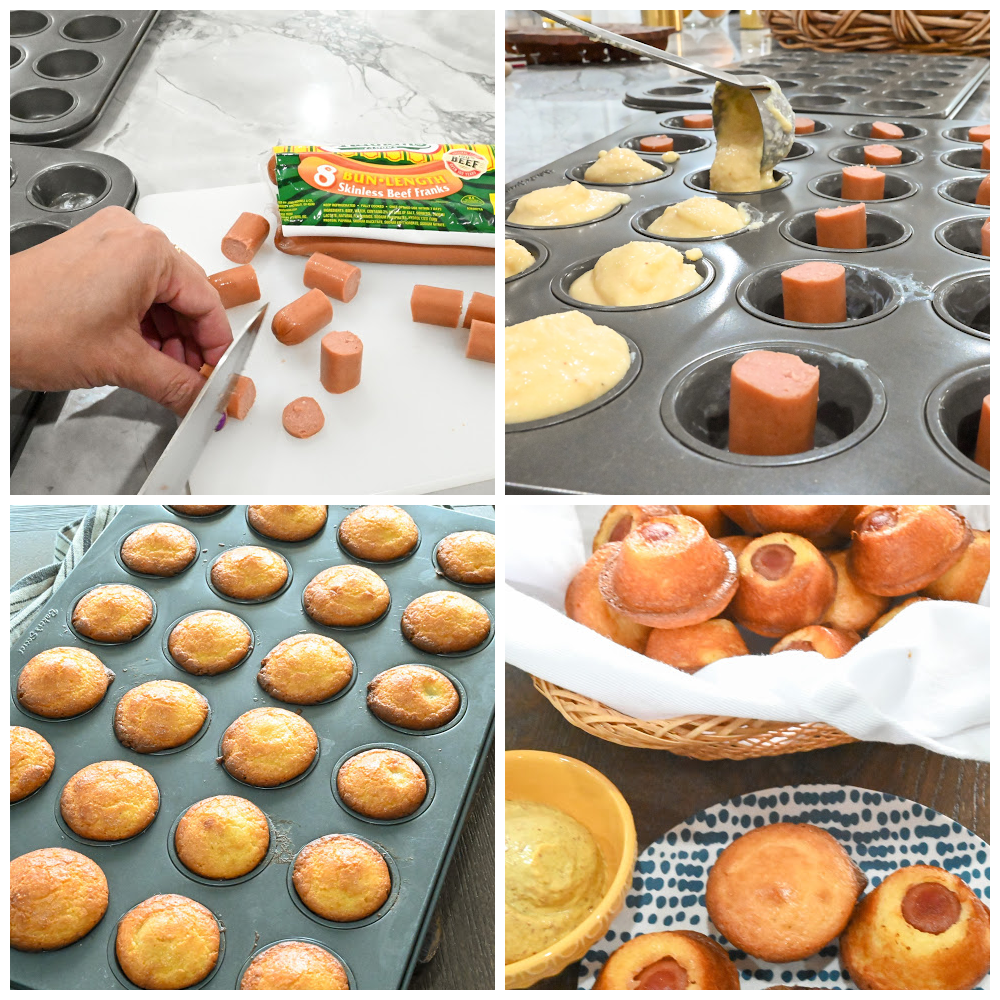 - Add a tablespoon of batter to each muffin, covering the top of the hot dogs.
