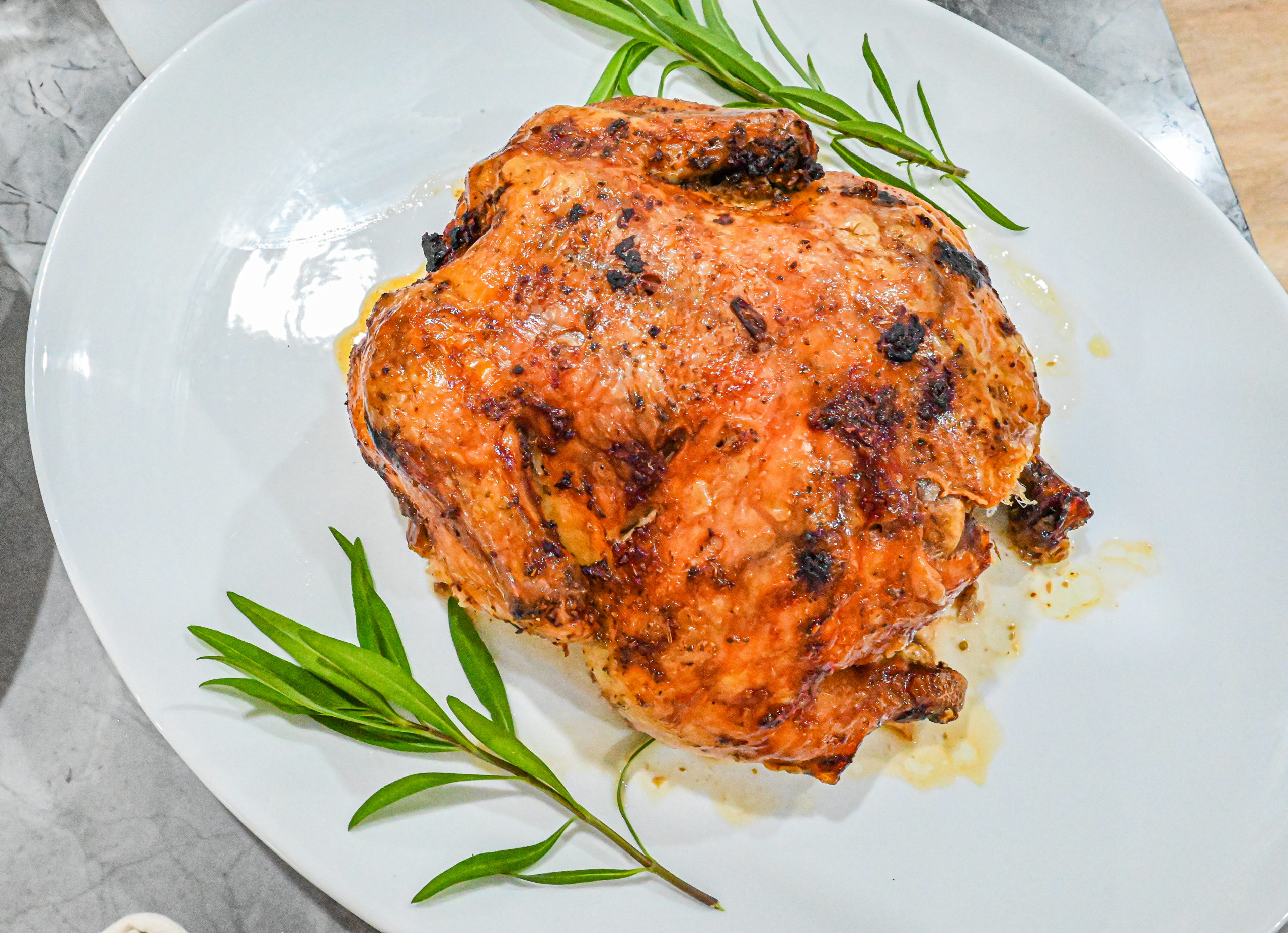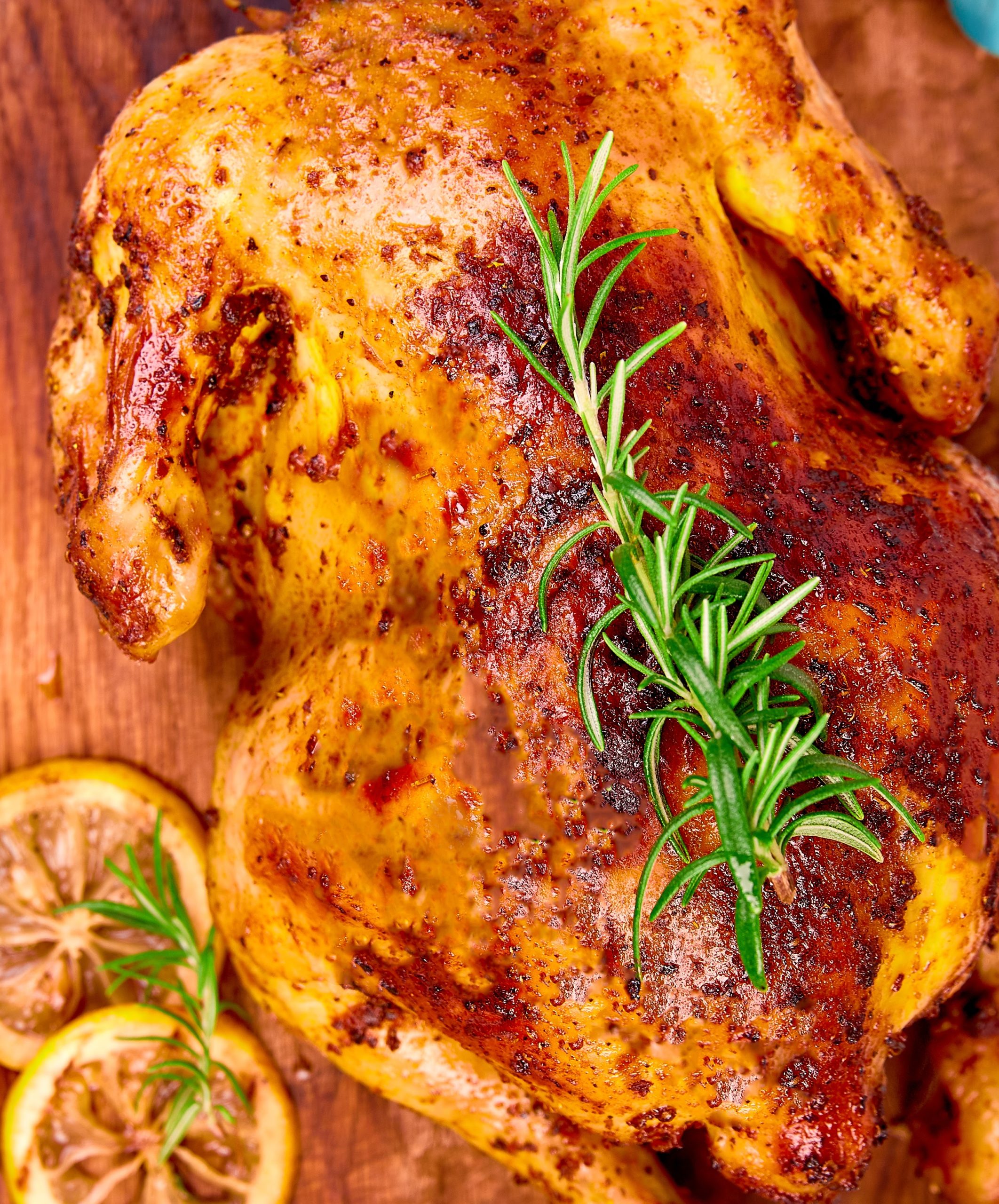 - After 30 minutes flip the whole chicken to the breast side up and continue to cook for about 10 to 15 minutes until the internal temperature reaches 165 ºF.