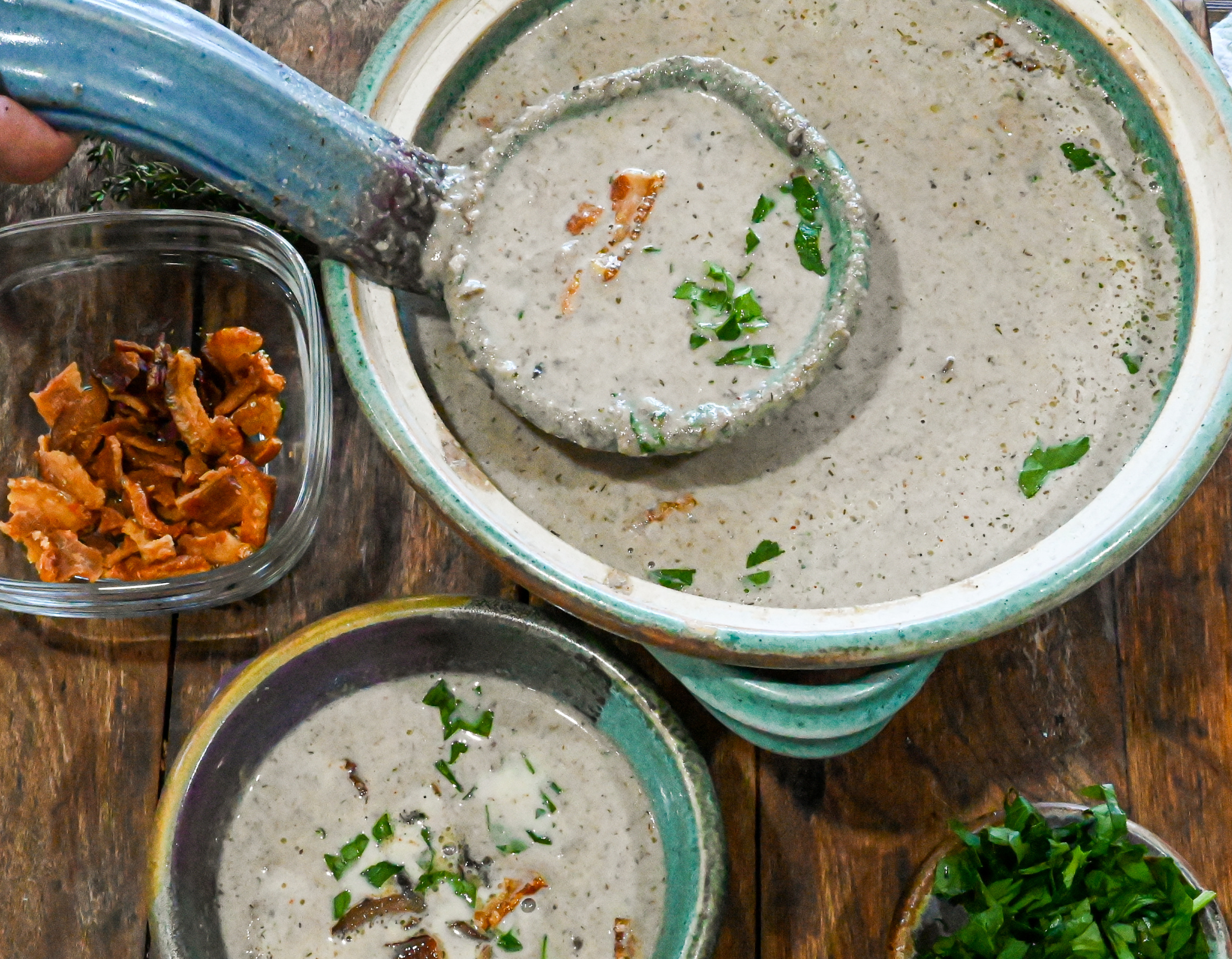 Once the entire soup has been blended, add it back to the quart pan and add the remaining mushrooms that have been fully caramelized. Taste for seasoning and serve hot.