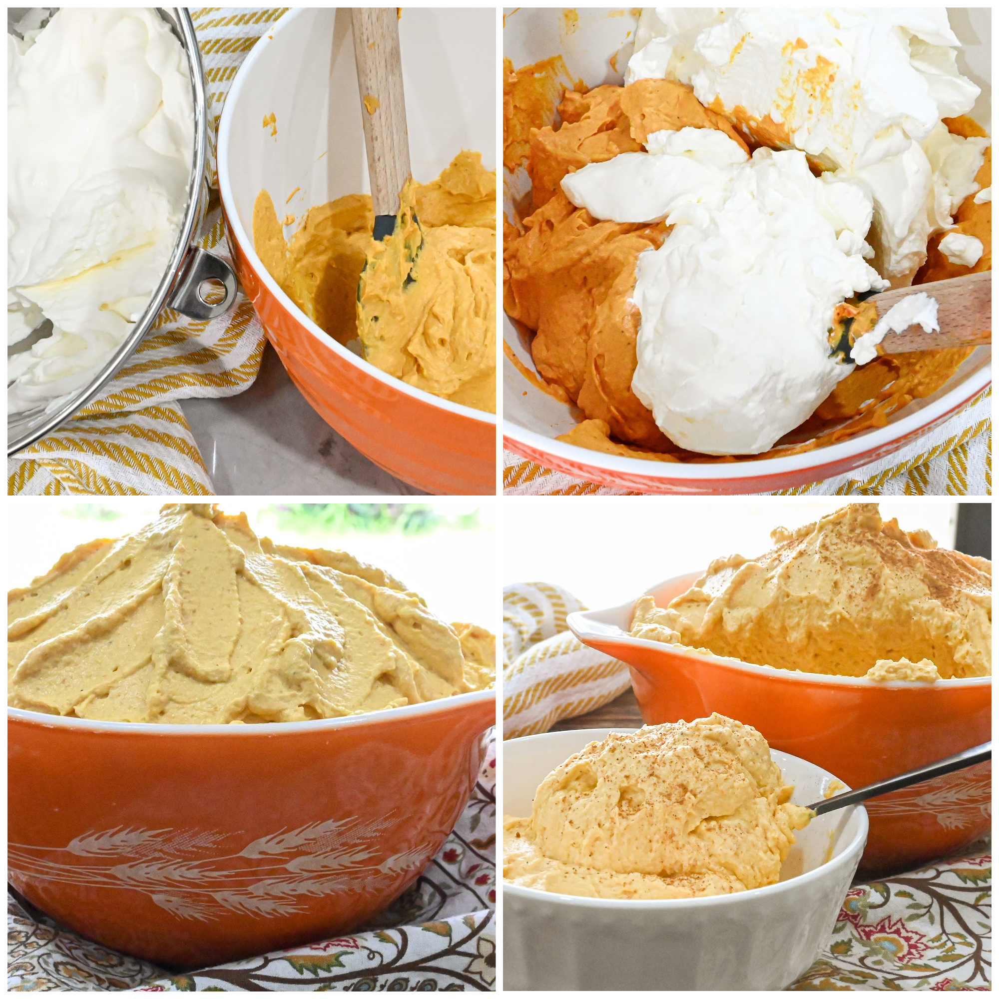 - Then, using a spatula, gently fold the whipped cream into the pumpkin mixture.