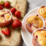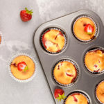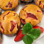 - Sprinkle the reserved ½ cup of chopped strawberries on the surface of each muffin.