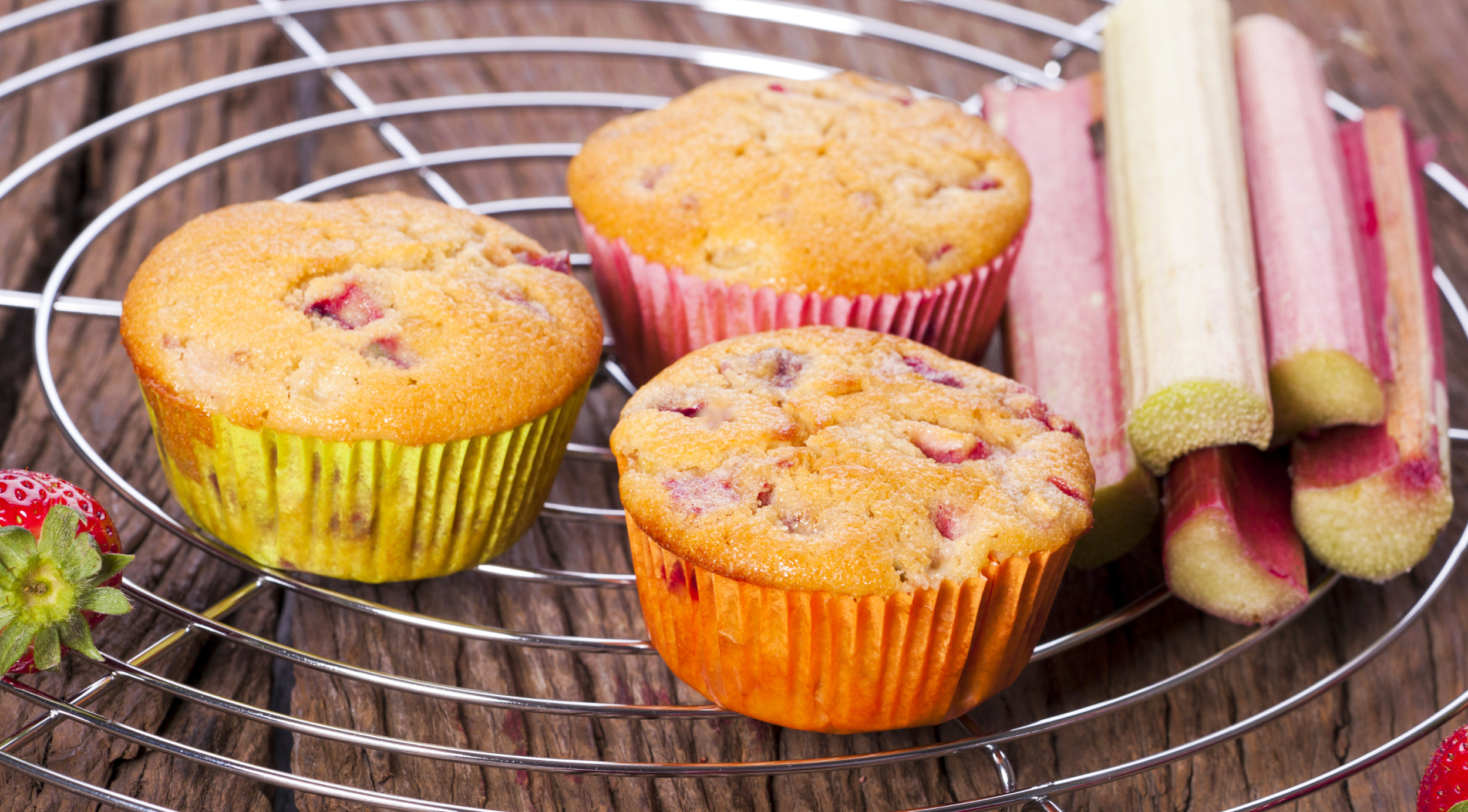 Taking a bite of a muffin that is studded with slices of strawberries that contrasts nicely with tart rhubarb is simply a winning combination.
