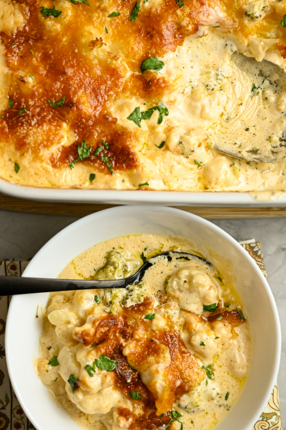 This healthy, easy keto cauliflower broccoli mac and cheese casserole can stand alone as a main meal or be served alongside your favorite protein.