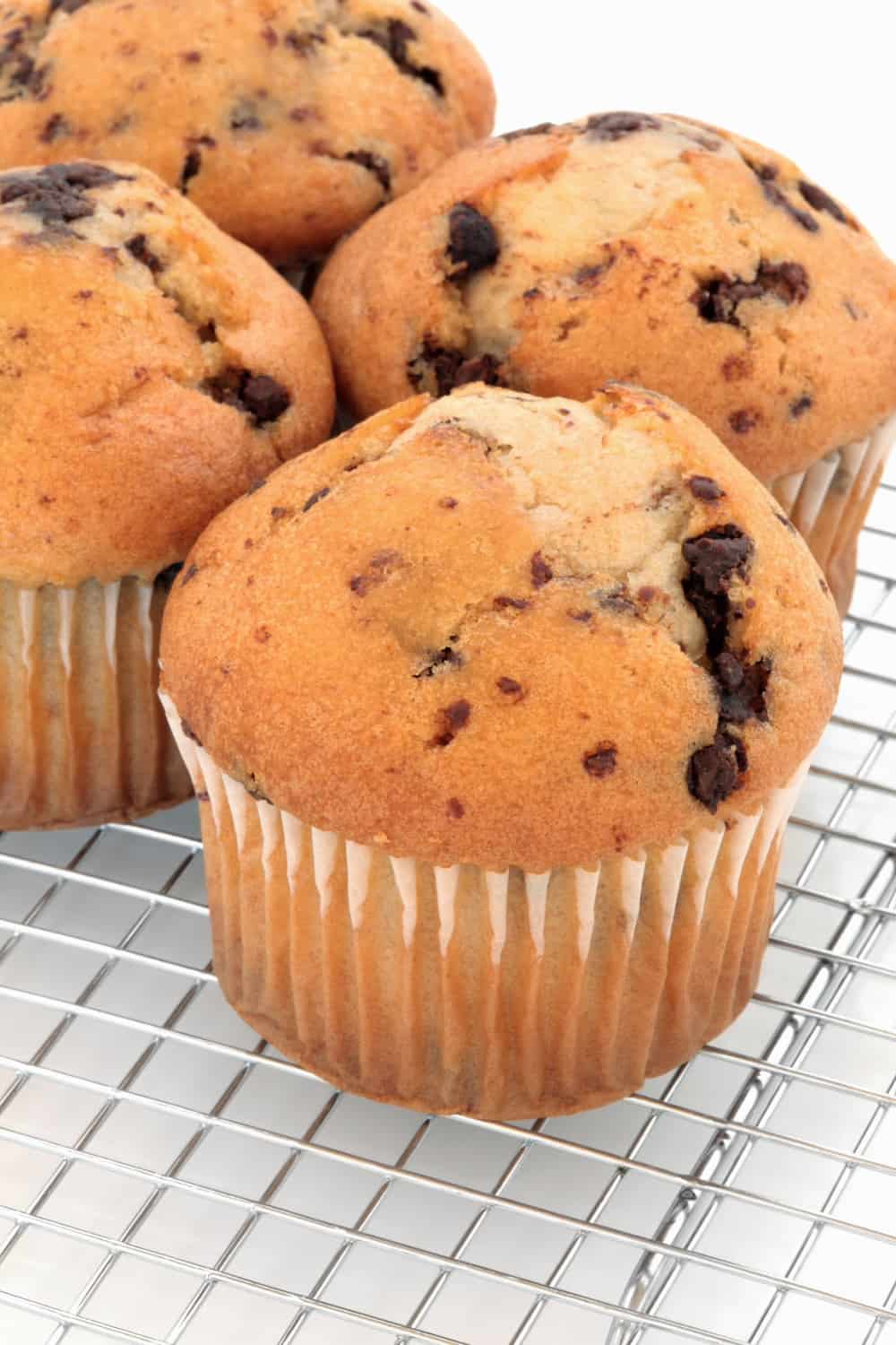 Spoon the batter evenly into the prepared muffin tins, about ¾ full. Then sprinkle the remaining chocolate chips and bake for 18-20 minutes until lightly golden brown.